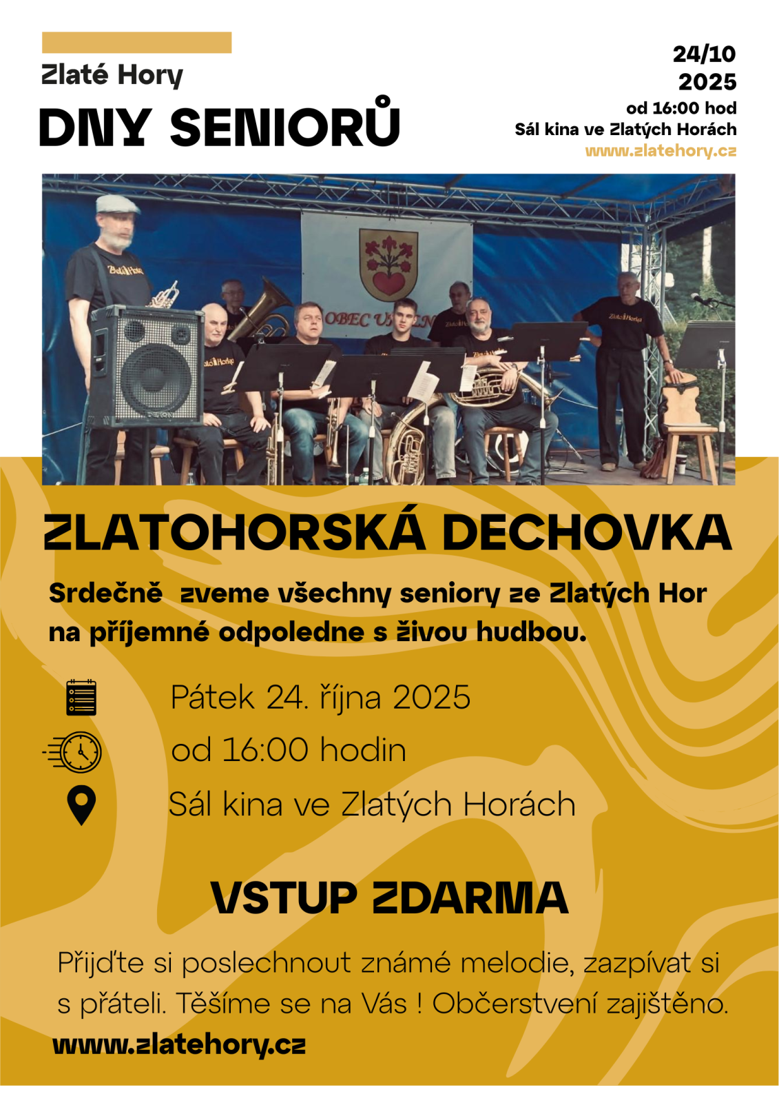DNY SENIORŮ 2025 - ZLATOHORSKÁ DECHOVKA / Koncerty 24.10.2025 od 16:00 do 19:00 hod. kino Zlaté Hory, Zlaté Hory | Mapa Srdečně zveme všechny seniory ze Zlatých Hor na příjemné odpoledne s živou hudbou. | |