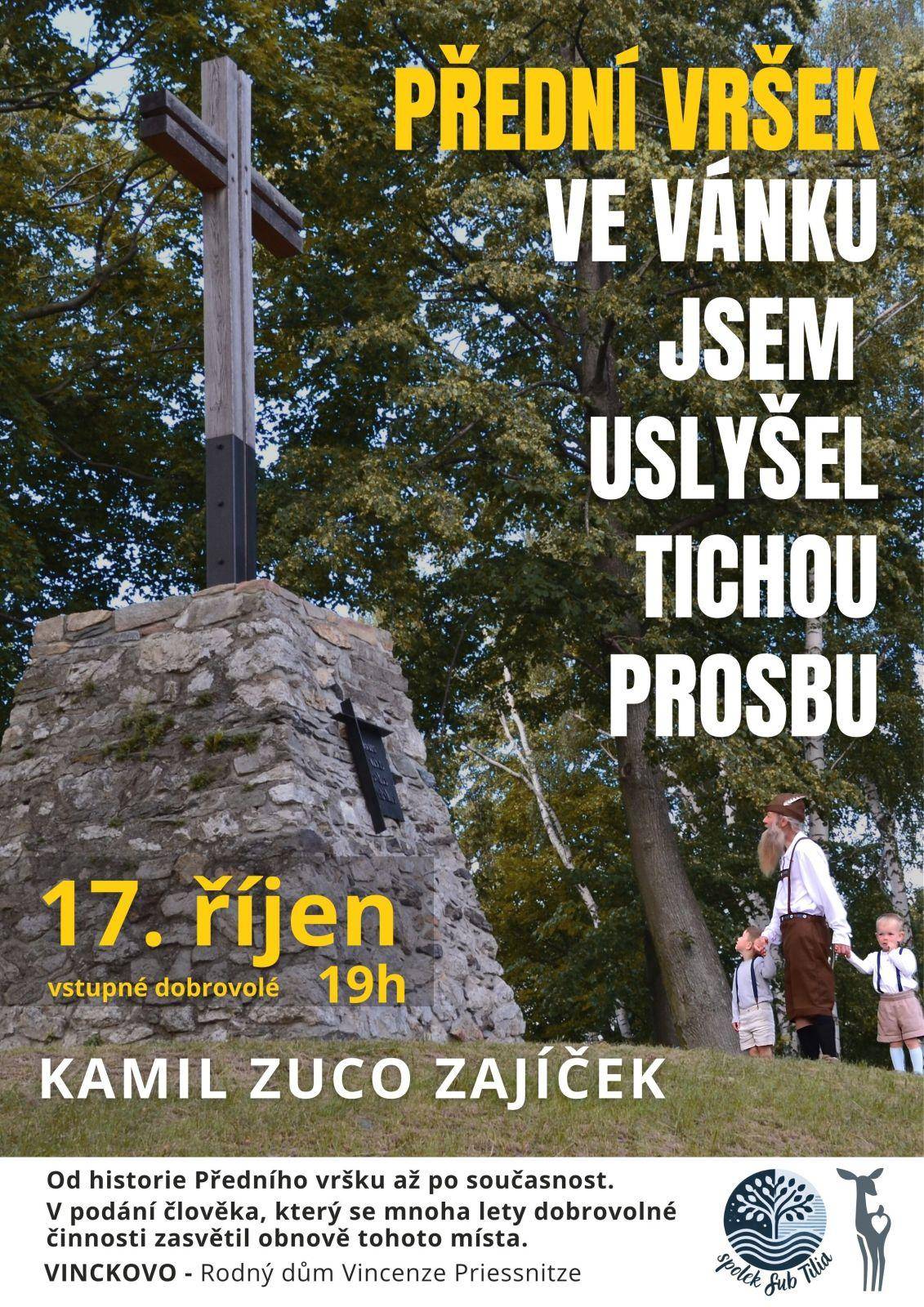 | 17.10.2025 od 19:00 do 21:00 hod. Vinckovo kafe, Jeseník | MapaOd historie Předního vršku až po současnost a vize budoucí. V podání člověka, který zasvětil mnoho let obnově silného místa. Vstupné dobrovolné. | |