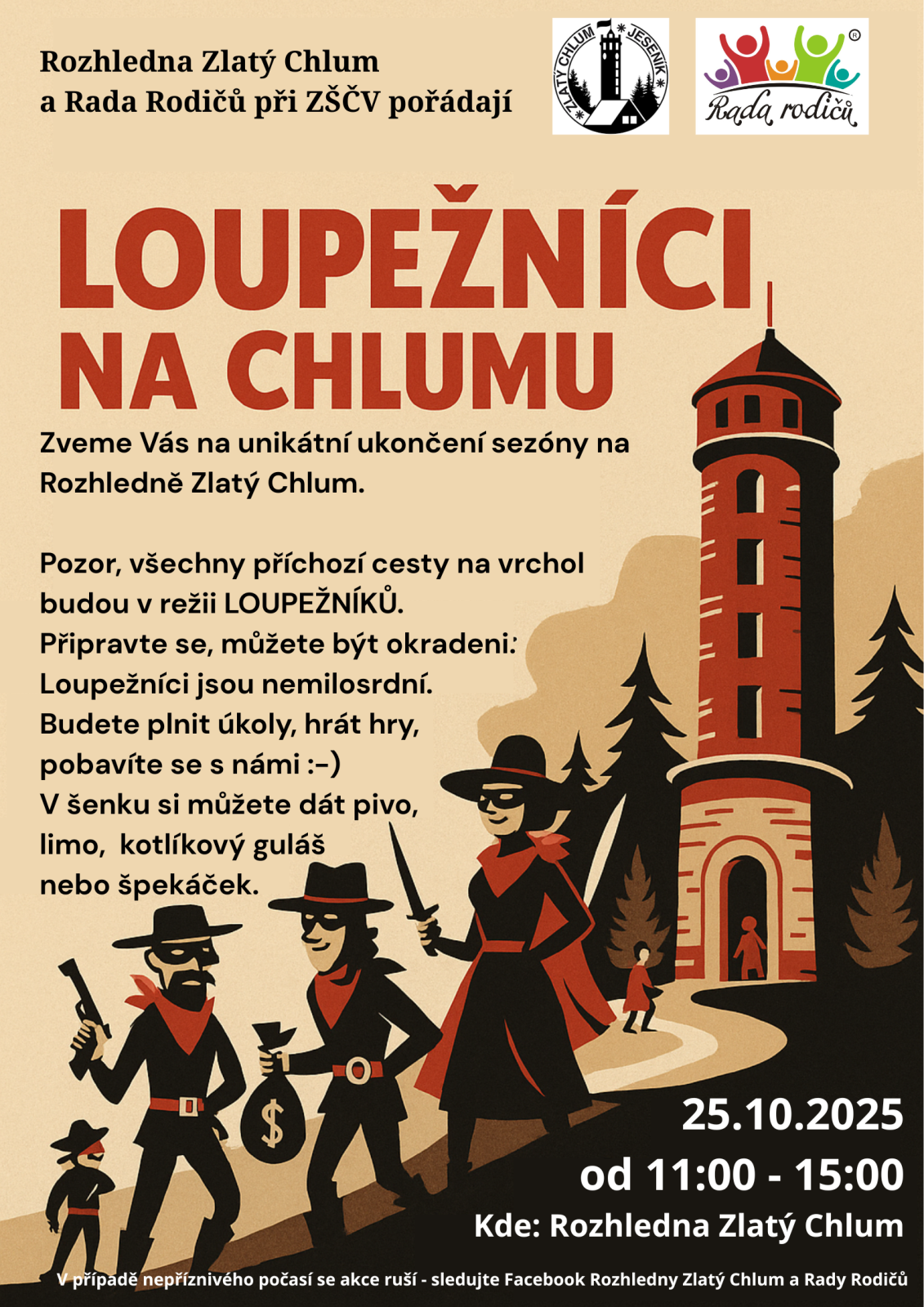 Unikátní ukončení sezóny na Rozhledně Zlatý Chlum. Cestou nahoru můžete být přepadeni nemilosrdnými loupežníky. Těšit se můžete na úkoly, hry a dobrou zábavu.