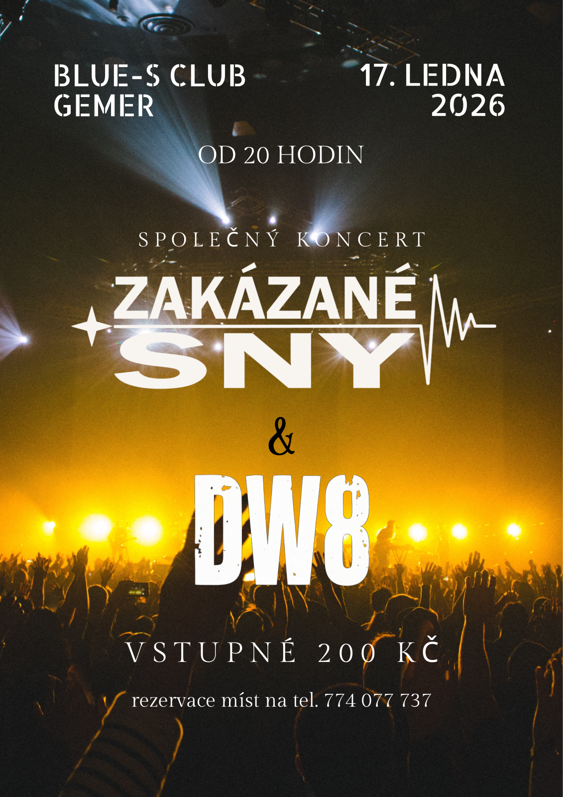 Dne 17.1.2026 od 20.00 se uskuteční koncert dvou jesenických kapel Zakázané sny a DW8Koncert proběhne v Blues club Gemer Jeseník.Rezervace vstupenek na čísle 774 077 737.Cena vstupenky 200,- O zvuk se postará náš kamarád Pepa Pekař