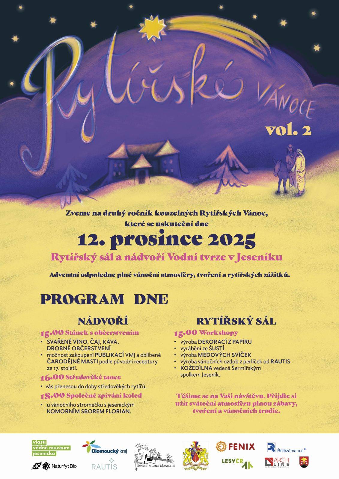 Zveme Vás na druhý ročník kouzelných Rytířských Vánoc, které se uskuteční 12. prosince 2025 od 15.00 hod. v Rytířském sále a na nádvoří Vodní tvrze v Jeseníku. Akce nabídne pestrý program plný tvoření, her a sváteční atmosféry.