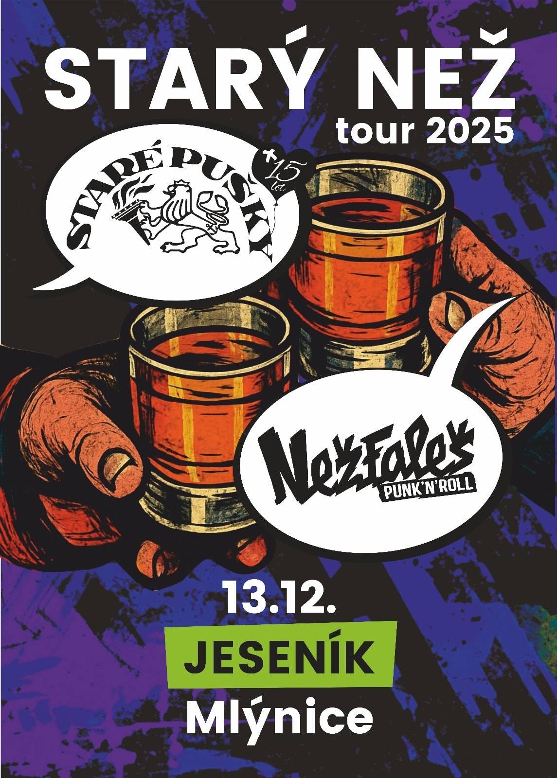 | 13.12.2025 od 18:00 do 23:59 hod. Přátelé z kapel Staré Pušky a Nežfaleš vyrážejí do Jeseníku! |