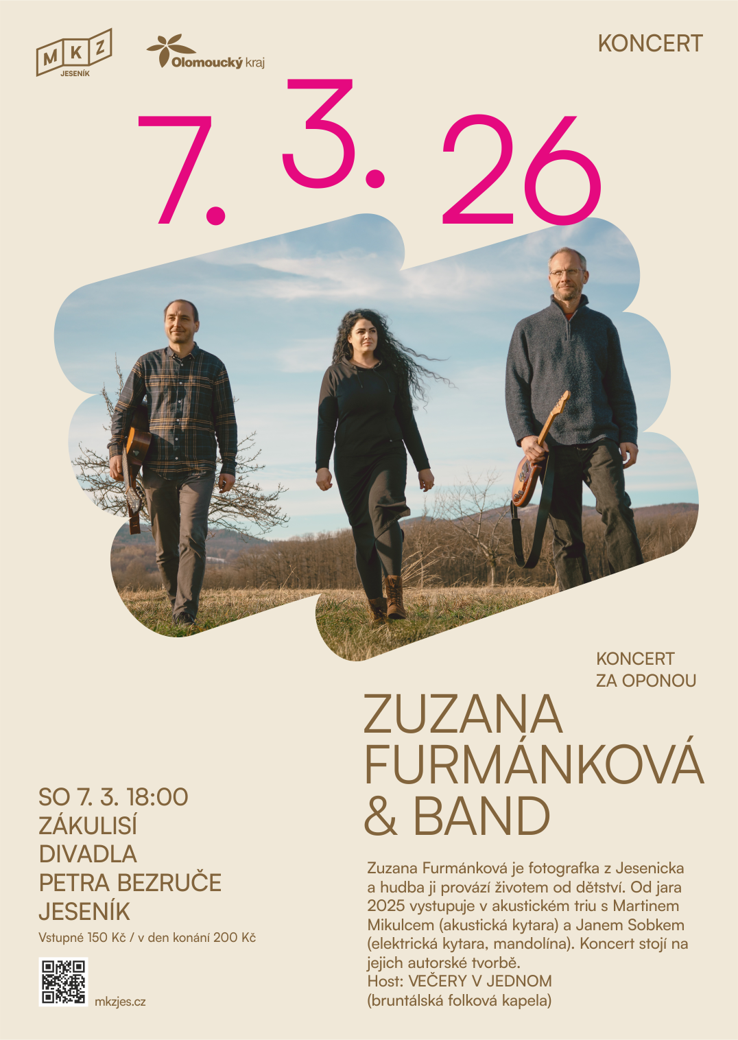 | 20.02.2026 od 19:00 do 21:00 hod. Vinckovo kafe, Jeseník | MapaImaginativní folk s jazzovým přesahem. Autorská hudba a poetické texty vás vtáhnou do světa jemných obrazů a nálad. Vstupné od 250,- Kč. |
