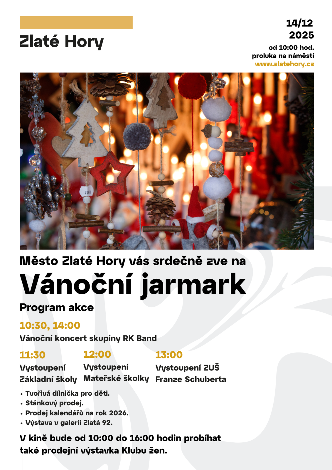 VÁNOČNÍ JARMARK ZLATÉ HORY (Ostatní) 14.12.2025 od 10:00 do 18:00 hod. nám. Svobody Zlaté Hory, Zlaté Hory | Mapa Vystoupení ZŠ, MŠ a ZUŠ Franze Schuberta Zlaté Hory. | |